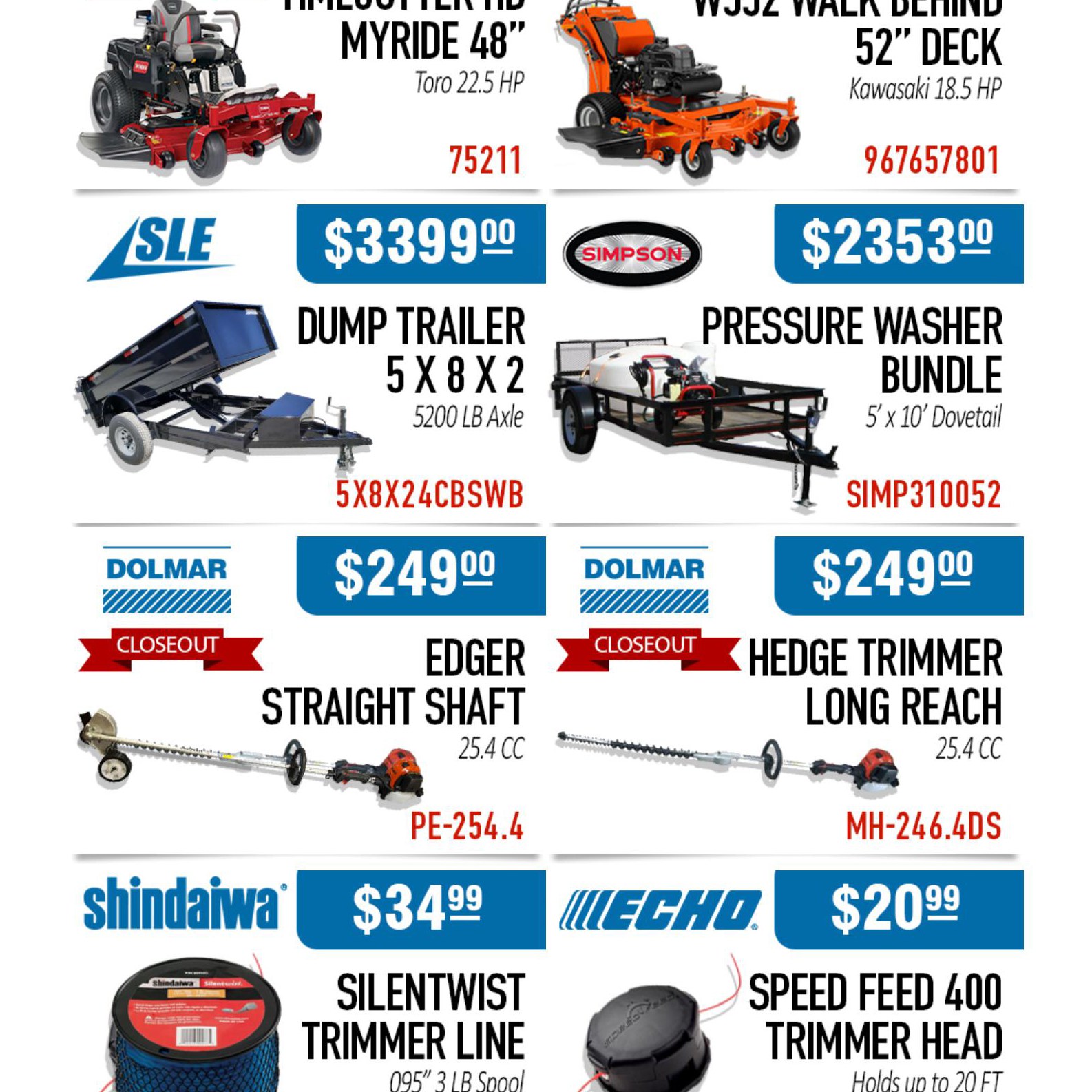 Brochures designed for SLE Equipment featuring outdoor power equipment, custom package deals, and repair service options.